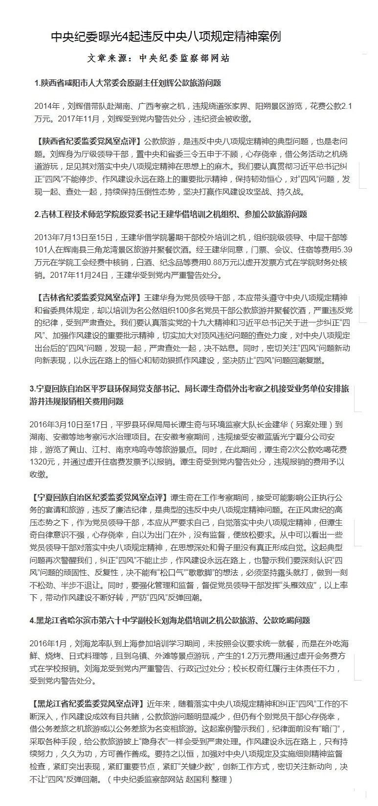 中央紀(jì)委曝光4起違反中央八項(xiàng)規(guī)定精神案例